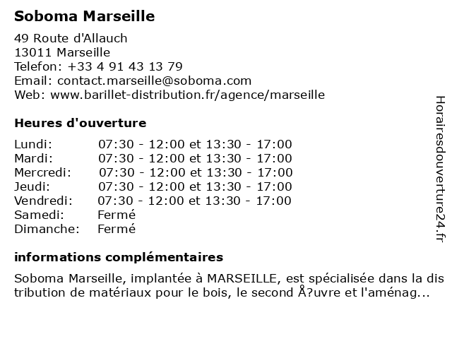 Soboma Marseille, implantée à MARSEILLE, est spécialisée dans la distribution de matériaux pour le bois, le second Å?uvre et l'aménagement intérieur et extérieur. L'offre couvre une lar...