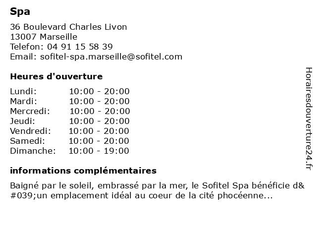 1 So Spa by Sofitel (Distance: 0,14 km) 36 Boulevard Charles Livon, 13007 Marseille beauté, by, coiffure, coiffures, coloristes, so, sofitel, spa 2 Spa Cinq Mondes (Distance: 0,43 km) 45 Quai Rive Neuve, 13007 Marseille bien-entre, cinq, massages, mondes, produits, relaxation, santé, spa, thérapies 3 Spa Deep Nature - Spa by Clarins (Distance: 0,92 km) 6 Place Daviel, 13002 Marseille beaute, boutique, by, clarins, de, deep, l’intercontinental, nature, soins, spa 4 Baron Amédée Armand Hotel & Spa Marseille - MGallery (Distance: 1,66 km) 11 Rue Lafon, 13006 Marseille amédée, armand, baron, hotel, marseille, mgallery, spa 5 Moment Fish Spa (Distance: 1,76 km) 92 cours Julien, 13006 Marseille fish, moment, pieds, poissons, pédicure, spa 6 Alex Hôtel & Spa (Distance: 1,81 km) 13-15 Place des Marseillaises, 13001 Marseille, Francia alex, boissons, chambres, hotel, hôtel, marseille, repas, services, spa |