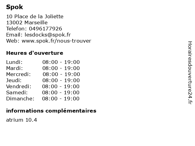 1 Spok (Distance: 0,07 km) 4 Place de la Joliette, 13002 Marseille cuisine, restaurant, restauration, spok 3 5 Spok (Distance: 2,02 km) 20 Boulevard Paul Peytral, 13006 Marseille cuisine, restaurant, restauration, spok 6 Spok (Distance: 2,91 km) 39 Avenue Jules Cantini, 13006 Marseille cuisine, restaurant, restauration, spok |