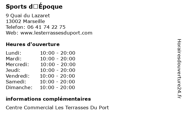 1 JD Sports (Distance: 0,00 km) 9 Quai du Lazaret, 13002 Marseille cafe, enfants.chaussures, jd, lingerie, mode hemmes, mode homme, restaurant, sports 2 JD Sports (Distance: 1,70 km) 31 Rue St Ferreol, 13001 Marseille articles de sport, jd, magasin de chaussures, magasin de vêtements pour enfants, magasin de vêtements pour femmes, magasin de vêtements pour hommes, sports 3 Bar Restaurant des Sports (Distance: 4,67 km) 69 Rue Antoine del Bello, 13010 Marseille bar, brasserie, café, des, restaurant, restauration, sports 4 JD Sports (Distance: 6,43 km) Centre Commercial Grand Littoral 11, Avenue De Saint Antoine Niveau Bas Corail, 13015 Marseille articles de sport, jd, magasin de chaussures, magasin de vêtements pour enfants, magasin de vêtements pour femmes, magasin de vêtements pour hommes, sports 5 JD Sports (Distance: 6,56 km) 11 Avenue de Saint Antoine, 13464 Marseille beaute, chaussures, deco, enfants, jd, mode femmes, mode hommes, restaurant, sport, sports 6 JD Sports (Distance: 6,76 km) 15 Avenue de Saint Antoine, 13015 Marseille hommes, jd, sport, sports, vêtements |