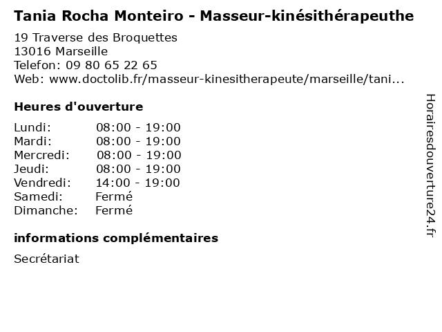 1 Cédric Monteiro - Masseur-kinésithérapeute (Distance: 8,88 km) 3 rue Saint Jacques, 13006 Marseille cedric, consultation, cédric, docteur, kinésithérapeute, masseur, med, medecine, medical, monteiro, médecin, traitement 2 Dr Lidiane Rocha-Serri - Échographiste (Distance: 10,96 km) 6 Rue Rocca, 13008 Marseille consultation, docteur, dr, lidiane, med, médecin, médecine, rocha, serri, traitement, Échographiste 3 Restaurant La Rocha (Distance: 11,16 km) 45 Promenade Georges Pompidou, 13008 Marseille alimentation, arménienne, la, libanais, restaurant, restauration, rocha, spécialités 4 Tania Cohen Ammar - Psychologue (Distance: 12,74 km) 166 Rue François Mauriac, 13010 Marseille ammar, cohen, psy, psychiatre, psychologue, sante, soins, tania 5 KINE SPORT 13 (Distance: 11,12 km) 9 Rue Gustave Eiffel, 13010 Marseille 13, kine, kiné, kinésithérapeuthe, kinésitérapie, rééducation, sport 6 Monteiro David (Distance: 27,98 km) 5 Impasse des Saules, 13920 Saint-Mitre-les-Remparts david, monteiro |