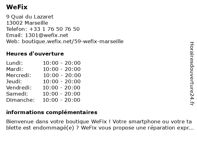1 WeFix (Distance: 0,03 km) 9 Quai du Lazaret, 13002 Marseille réparation, services, technique, wefix, électronique 3 WeFix (Distance: 1,37 km) 17 Cours Belsunce, 13001 Marseille réparation, services, technique, wefix, électronique 6 |