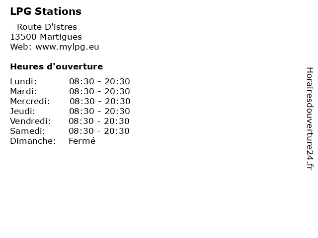 1 LPG Stations (Distance: 10,80 km) - Route de Fos-sur-mer, 13800 Istres france, gas, lpg, services, stations 2 LPG Stations (Distance: 12,58 km) - Chemin Bord de Crau, 13800 Istres france, gas, lpg, services, stations 3 LPG Stations (Distance: 15,79 km) - Autoroute a7, 13127 Vitrolles france, gas, lpg, services, stations 4 LPG Stations (Distance: 15,90 km) - Avenue Victor Gelu, 13127 Vitrolles france, gas, lpg, services, stations 5 LPG Stations (Distance: 17,17 km) - de Rebuty, 13180 Gignac la Nerthe france, gas, lpg, services, stations 6 LPG Stations (Distance: 17,77 km) - Avenue Rhin Danube, 13127 Vitrolles france, gas, lpg, services, stations |