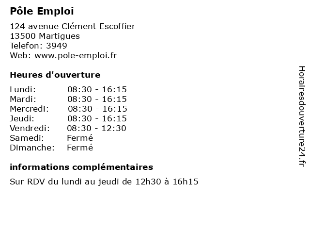 1 Pôle Emploi (Distance: 3,66 km) - Rue Nedelec, 13110 Port de Bouc administration, agence, candidats, emploi, employeurs, offres, pole, public, publique, pôle, recherche, service, travail 2 Pôle Emploi (Distance: 10,17 km) 4 Allée de la Solidarité, 13800 Istres administration, agence, candidats, emploi, employeurs, offres, pole, public, publique, pôle, recherche, service, travail 3 Pôle Emploi (Distance: 13,88 km) 1 avenue Jacqueline Auriol, 13700 Marignane administration, agence, candidats, emploi, employeurs, offres, pole, public, publique, pôle, recherche, service, travail 4 Pôle Emploi (Distance: 18,55 km) 3 voie d'Allemagne, 13127 Vitrolles administration, agence, candidats, emploi, employeurs, offres, pole, public, publique, pôle, recherche, service, travail 5 Pôle Emploi (Distance: 18,57 km) 4 boulevard Jacques Minet, 13140 Miramas administration, agence, candidats, emploi, employeurs, offres, pole, public, publique, pôle, recherche, service, travail 6 Samsic Emploi (Distance: 2,08 km) 5 Rue Vaucanson, 13500 Martigues emploi, intérim, recrutement, samsic |