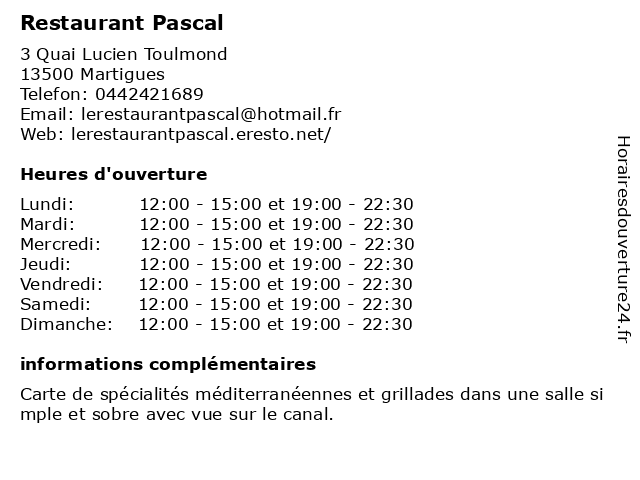 | Dimanche | 12:00-15:00 et 19:00-22:30 |