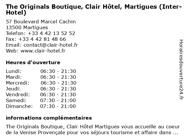 1 Hôtel Clair Hôtel - Réception (Inter-Hôtel) (Distance: 0,01 km) 57 Boulevard Marcel Cachin null, 13500 Martigues clair, hebergement, hotel, hôtel, inter, réception 2 Inter Hotel Clair Hotel (Distance: 0,03 km) 57 Boulevard Marcel Cachin, 13500 Martigues bar, clair, hotel, inter, restaurant, service 3 Hotel Eden (Distance: 0,31 km) . Boulevard Emile Zola, 13500 Martigues bar, eden, hotel, restaurant, service 4 Hotel Le Grand Canal (Distance: 1,07 km) 1 Avenue José Nobre, 13500 Martigues bar, canal, grand, hotel, le, restaurant, service 5 B&B Hotel Martigues Port de Bouc (Distance: 5,78 km) . Avenue de la Mer, 13110 Port de Bouc b&b, bar, bouc, cafe, de, hotel, martigues, port, restaurant, service 6 Hotel Première Classe Marseille Ouest Martigues (Distance: 6,73 km) . Chemin du Stade de Croix Sainte, 13500 Martigues bar, classe, hotel, marseille, martigues, ouest, première, restaurant, service |