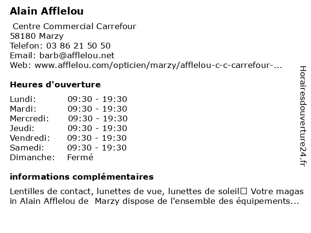1 Alain Afflelou (Distance: 2,18 km) Centre Commercial Intermarché, 58000 Nevers afflelou, alain, cabinet d'ophtalmologie, magasin de lunettes de soleil, ophtalmologie, optométrie 2 MAGIC AFFLELOU Marzy (Distance: 0,00 km) Centre Commercial Carrefour, 58180 Marzy afflelou, magasin de lentilles correctrices, magasin de lunettes de soleil, magic, marzy, optométrie 3 Audioprothésiste Marzy-Alain Afflelou Acousticien (Distance: 0,11 km) Centre Commercial Carrefour Marzy, 58180 Marzy acousticien, afflelou, alain, audiologie, audioprothésiste, clinique médicale, marzy 4 Alain Leplay - Masseur-kinésithérapeute (Distance: 2,26 km) 1 avenue Patrick Guillot, 58033 Nevers alain, consultation, docteur, kinésithérapeute, leplay, masseur, med, medecine, medical, médecin, traitement 5 Dr Alain Bouzat - Radiologue (Distance: 2,26 km) 1 avenue Patrick Guillot, 58033 Nevers alain, bouzat, consultation, docteur, dr, med, medecine, medical, médecin, radiologue, traitement 6 Dr Alain Sacquard - Médecin généraliste (Distance: 2,26 km) 1 avenue Patrick Guillot, 58033 Nevers alain, consultation, docteur, dr, généraliste, med, medecine, medical, médecin, sacquard, traitement |