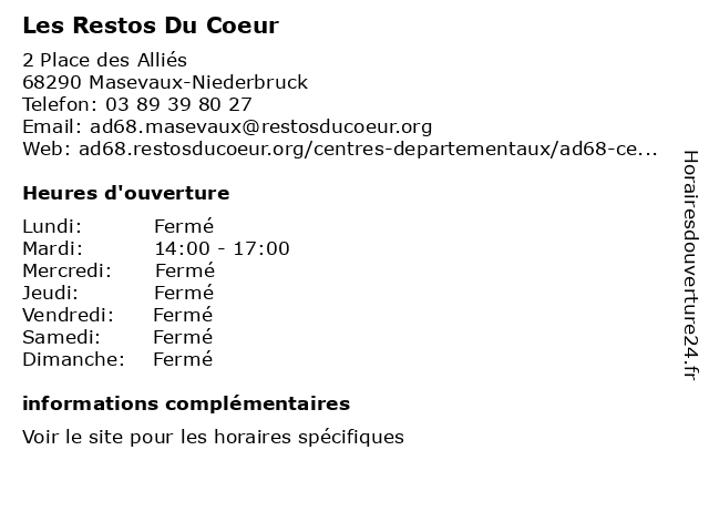1 Les Restos Du Coeur (Distance: 4,57 km) - Foyer Rural, 90110 Rougemont le Château aides, alimentaire, coeur, du, les, restos, santé, solidarité, soutien 2 Les Restos Du Coeur (Distance: 9,24 km) 23 Rue Henri Lebert, 68800 Thann aides, alimentaire, coeur, du, les, restos, santé, solidarité, soutien 3 Les Restos Du Coeur (Distance: 11,40 km) 49 Rue Charles de Gaulle, 68550 Saint-Amarin aides, alimentaire, coeur, du, les, restos, santé, solidarité, soutien 4 Les Restos Du Coeur (Distance: 12,82 km) 2 Place Turenne, 90150 Fontaine aides, alimentaire, coeur, du, les, restos, santé, solidarité, soutien 5 Les Restos Du Coeur (Distance: 13,08 km) 3 rue des casernes, 90200 Giromagny aides, alimentaire, coeur, du, les, restos, santé, solidarité, soutien 6 Les Restos Du Coeur (Distance: 14,07 km) 32 Avenue Charles de Gaulle, 68700 Cernay aides, alimentaire, coeur, du, les, restos, santé, solidarité, soutien |