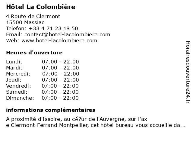1 Hôtel de la Poste Sté d'Exploitation (Distance: 1,17 km) 26 Avenue du Général de Gaulle, 15500 Massiac d'exploitation, de, hôtel, la, poste, sté 2 Hôtel Restaurant La Sapinière (Distance: 14,93 km) 10 Avenue Paul Chambriard, 43100 Brioude hôtel, la, restaurant, sapinière 3 Hôtel de la dentelle (Distance: 15,01 km) 29 rue du 4 septembre, 43100 Brioude ceramique, de, dentelle, expositions, fleurs, hotel, hôtel, la, ombrelles, peinture 4 Hôtel de la dentelle - basse saison (Distance: 15,01 km) 29 rue du 4 Septembre, 43100 Brioude basse, ceramique, de, dentelle, expositions, fleurs, hotel, hôtel, la, ombrelles, peinture, saison 5 Hôtel Restaurant Poste et Champanne (Distance: 15,05 km) 1 Boulevard Docteur Devins, 43100 Brioude champanne, et, hôtel, poste, restaurant 6 Artemis Hôtel Restaurant Brioude (Distance: 15,26 km) Impasse de Conchette, 43100 Cohade artemis, brioude, hôtel, restaurant |