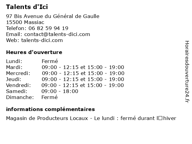 | Mardi | 09:00-12:15 et 15:00-19:00 |