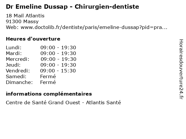 1 Dr Emeline Dussap - Chirurgien-dentiste (Distance: 15,01 km) 14 Bis Boulevard de l'Hôpital, 75005 Paris chirurgien, dentiste, dr, dussap, emeline, médecin, médecine, médical, pharmaceutique, traitement 2 Dr Emeline Dussap - Chirurgien-dentiste (Distance: 17,29 km) 2 b Rue Marcel Proust, 78180 Montigny-le-Bretonneux chirurgien, consultation, dentiste, docteur, dr, dussap, emeline, med, médecin, médecine, traitement 3 Emeline Violeau - Chiropracteur - Secretariat (Distance: 4,15 km) 17 Rue de l'Église, 92160 Antony chiropracteur, emeline, medical, médecines, secretariat, thérapie, violeau 4 Emeline Prat - Masseur-kinésithérapeute (Distance: 7,91 km) 63 Avenue de la Division Leclerc, 92320 Châtillon docteur, emeline, kinésithérapeute, masseur, médecin, médecine, prat, secrétariat 5 Emeline Prat - Masseur-kinésithérapeute (Distance: 8,01 km) 63 Avenue de la Division Leclerc, 92320 Châtillon emeline, kiné, kinésithérapeute, masseur, prat, rééducation, soin 6 Dr Emeline de la Robertie - Homéopathe (Distance: 13,35 km) 37 Rue des Volontaires, 75015 Paris de, dr, emeline, homéopathe, la, médecin, médecine, médical, pharmaceutique, robertie, traitement |
