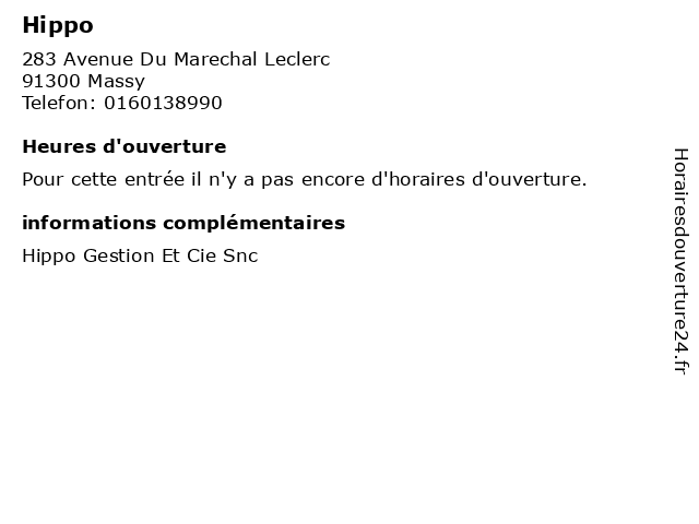 1 Hippo (Distance: 5,35 km) 134 Avenue Du General Leclerc, 92340 Bourg La Reine gestion, hippo, restaurants 5 Hippo (Distance: 12,31 km) 22 Avenue Du General Leclerc, 92100 Boulogne Billancourt gestion, hippo, restaurants 6 Hippo (Distance: 12,35 km) M Boyer Zac Du Port d Ivry, 94200 Ivry Sur Seine gestion, hippo, restaurants |