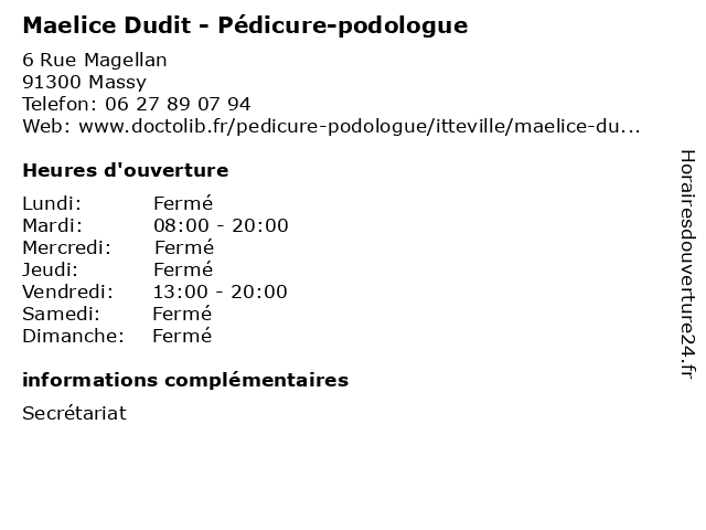 1 Laure Delsarte - Pédicure-podologue (Distance: 0,08 km) 15 Rue Marco Polo, 91300 Massy cheville, delsarte, laure, orteil, pied, podologue, pédicure 2 Mylene Foisset - Pédicure-podologue (Distance: 0,90 km) 55 Rue des Ruelles, 91300 Massy cheville, foisset, mylene, orteil, pied, podologue, pédicure 3 Rémi Peyrel - Pédicure-podologue (Distance: 0,96 km) 2 Rue Gabriel Péri, 91300 Massy dr, medical, peyrel, podologue, pédicure, rémi, secrétariat 4 Cécile Racine - Pédicure-podologue (Distance: 2,10 km) 20 Rue de Paron, 91370 Verrières-le-Buisson cheville, cécile, orteil, pied, podologue, pédicure, racine 5 Cécile Vandame - Pédicure-podologue (Distance: 2,18 km) 15 Rue de Migneaux, 91370 Verrières-le-Buisson cheville, cécile, orteil, pied, podologue, pédicure, vandame 6 Bénédicte Joly - Pédicure-podologue (Distance: 2,28 km) 86 Rue Adolphe Pajeaud, 92160 Antony bénédicte, consultation, docteur, joly, med, médecin, médecine, podologue, pédicure, traitement |