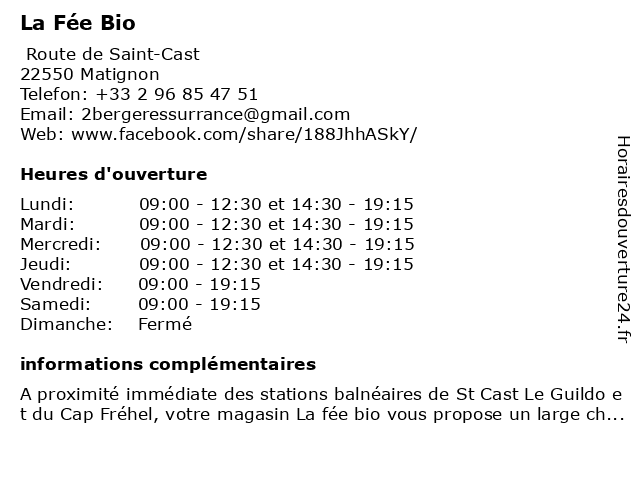1 Origin' Bio - Accord Bio (Distance: 8,88 km) 1 Rue des Artisans, 22240 Plurien accord, alimentation, bio, diététique, epicerie, fruits, légumes, nature, origin', pain, soins, thé 3 La Coop Bio Dinard Emeraude (Distance: 17,37 km) 18 Rue de la Ville Biais, 35780 La Richardais bio, coop, dinard, emeraude, la 4 Fée Minine (Distance: 18,48 km) 6 place de la République, 35780 La Richardais beauté, esthétique, fée, manucure, minine, salon, spa 5 La Fée Maraboutée (Distance: 20,43 km) 43 rue Ville Pépin, 35400 Saint-Malo accessoires, femme, fée, la, magasin, maraboutée, mode 6 La Fée Coquette (Distance: 31,39 km) 4 place Duguesclin, 22250 Broons art, coquette, fée, la, manucure, nail, ongles, permanent, protésiste, vernis |