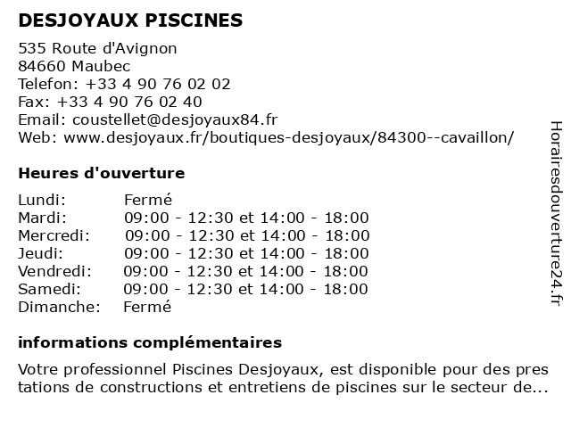 | Samedi | 09:00-12:30 et 14:00-18:00 |
