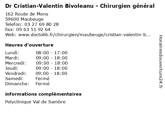 1 Dr Elena Bivoleanu - Endocrinologue (Distance: 0,03 km) 162 Route de Mons, 59600 Maubeuge bivoleanu, dr, elena, endi, endocrinologue, medecin, sante 2 Dr Mehdi Aarab - Chirurgien général (Distance: 0,08 km) 162 Route de Mons, 59600 Maubeuge aarab, chirurgien, docteur, dr, général, mehdi, sante, soins 3 Medecin Jean Louis Hosselet (Chirurgien général) (Distance: 0,12 km) 162 Route de Mons, 59600 Maubeuge chirurgien, docteur, général, hosselet, jean, louis, medecin, sante, services 4 Medecin Jean Louis Hosselet - Horaires Cabinet (Chirurgien général) (Distance: 0,12 km) 162 Route de Mons, 59600 Maubeuge cabinet, chirurgien, docteur, général, horaires, hosselet, jean, louis, medecin, sante, services 5 Dr Laura Mart - Chirurgien général (Distance: 2,17 km) 13 Boulevard Pasteur, 59600 Maubeuge chirurgien, consultation, docteur, dr, général, laura, mart, med, médecin, médecine, traitement 6 Dr. Irina-Nicoleta Penciuc - Chirurgien général (Distance: 2,17 km) 13 Boulevard Pasteur, 59600 Maubeuge chirurgien, consultation, docteur, dr., général, irina, med, médecin, médecine, nicoleta, penciuc, traitement |