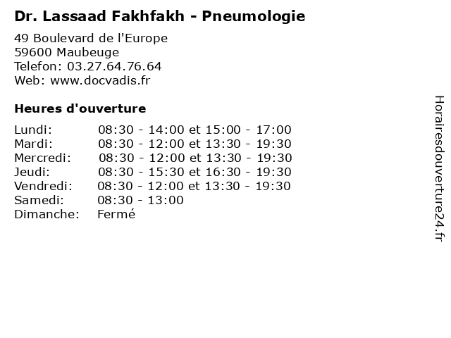 1 Cabinet médical du Docteur Fakhfakh - Pneumologie (secrétariat ) (Distance: 0,00 km) 49 Boulevard de l'Europe, 59600 Maubeuge cabinet, consultation, docteur, du, fakhfakh, médical, pneumologie, santé, secrétariat 2 Dr. Marc Derollez - Pneumologie (Distance: 1,19 km) 11 rue du tivoli, 59600 Maubeuge consultation, derollez, docteur, dr., marc, pneumologie, santé 3 Dr Lassaad Fakhfakh - Pneumologue - secrétariat (Distance: 1,47 km) 135 rue Saint Antoine,, 59600 Maubeuge dr, fakhfakh, lassaad, médecins, médicaments, pneumologue, santé, secrétariat, spécialiste 4 Dr Lassaad Fakhfakh - Pneumologue (Distance: 2,11 km) 162 Route de Mons,, 59600 Maubeuge dr, fakhfakh, lassaad, médecins, médicaments, pneumologue, santé, secrétariat, spécialiste 5 Dr. Dominique Guffroy - Pneumologie (Autre) (Distance: 2,21 km) 162 route de Mons, 59600 Maubeuge autre, consultation, docteur, dominique, dr., guffroy, pneumologie, santé 6 Dr. Dominique Guffroy - Pneumologie (Consultation sur rendez-vous) (Distance: 2,21 km) 162 route de Mons, 59600 Maubeuge consultation, docteur, dominique, dr., guffroy, pneumologie, rendez, santé, sur, vous |
