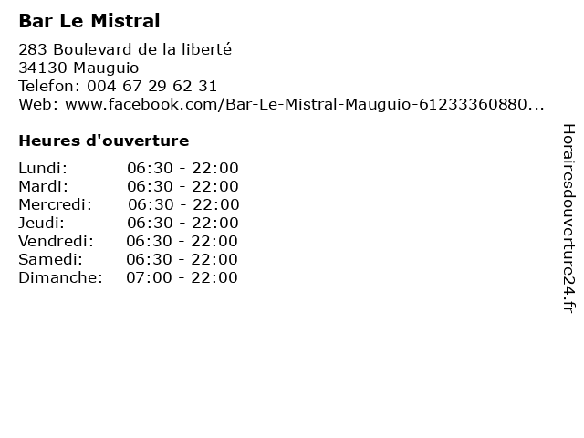 | Vendredi | 06:30-22:00 |