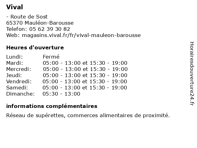 1 Vival (Distance: 11,33 km) - Rue Gallieni, 31440 Saint-Béat alimentaire, discount, distributeur, distribution, fruits, grande, hypermarché, légumes, supermarché, vival, épicerie 2 Vival (Distance: 14,79 km) , Avenue de Luchon,, 31210 Martres-de-Rivière bread, deli, fish shop, gas bottles, photocopy, removing packages, vival, wine cellar 3 Vival (Distance: 17,84 km) 1 Place de l'Église,, 65240 Arreau droguerie, d’hypermarchés, frais, fruits et légumes, hygiène, parfumerie et autres produits non alimentaires., surgelés, vival, épicerie 4 Vival (Distance: 23,94 km) - Le Village, 31580 Saint-Plancard droguerie, d’hypermarchés, frais, fruits et légumes, hygiène, parfumerie et autres produits non alimentaires., surgelés, vival, épicerie 5 Vival by Casino (Distance: 36,65 km) - Le Bourg, 65230 Campuzan by, casino, droguerie, d’hypermarchés, frais, fruits et légumes, hygiène, parfumerie et autres produits non alimentaires., surgelés, vival, épicerie 6 Vival (Distance: 38,43 km) , Piau, 65170 Aragnuoet bread, deli, fish shop, gas bottles, photocopy, removing packages, vival, wine cellar |