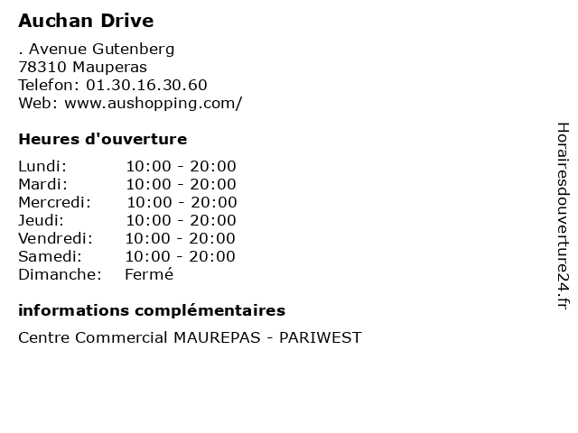 1 Auchan Drive (Distance: 0,35 km) 4 Rue Marie Curie, 78310 Coignieres auchan, drive, hypermarche, marche, market 2 Auchan Drive (Distance: 8,18 km) 161 Chemin Départemental, 78370 Plaisir auchan, beaute, boutiques, chaussures, deco, drive, enfants, mode femme, mode hommes, restaurant, sport 3 Parapharmacie Auchan (Distance: 0,00 km) . Avenue Gutenberg, 78310 Mauperas auchan, beaute, cafe, calzedonia, chaussures, enfants, lingerie, mode femmes, mode hommes, parapharmacie, restaurant, sec, service, sport 4 Auchan (Distance: 0,00 km) . Avenue Gutenberg, 78310 Mauperas auchan, beaute, cafe, calzedonia, chaussures, enfants, lingerie, mode femmes, mode hommes, restaurant, sec, service, sport 5 Optique Auchan (Distance: 8,08 km) 161 Chemin départemental, 78370 Plaisir auchan, cafe, chaussures, enfants, homme, mode femme, optique, restaurant, service, sport 6 Auchan Optique (Distance: 8,08 km) 161 Chemin départemental, 78370 Plaisir auchan, aushopping, centre, commercial, optique, plaisir  |