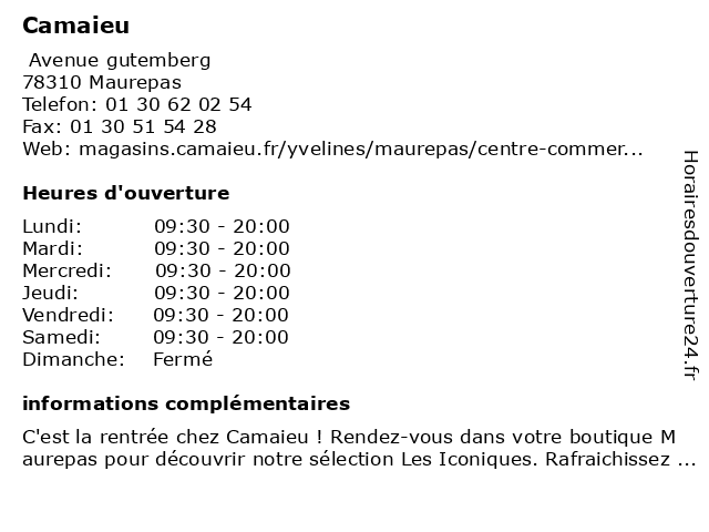 1 Camaieu (Distance: 0,56 km) . Avenue Gutenberg, 78310 Mauperas accessoires, boutiques, camaieu, camaïeu, chemises, pantalons, vêtements 2 Camaieu (Distance: 9,60 km) 5 Rue colbert, 78180 Montigny-Le-Bretonneux camaieu, magasin de chaussures, magasin de t-shirts, magasin d’accessoires de mode, maroquinerie, mode 3 Camaieu (Distance: 9,72 km) 11 Avenue jean jaurès, 78390 Bois D'Arcy camaieu, magasin de chaussures, magasin de t-shirts, magasin d’accessoires de mode, maroquinerie, mode 4 Camaieu (Distance: 16,34 km) 2 Avenue du général de gaulle, 78150 Le Chesnay camaieu, magasin de chaussures, magasin de t-shirts, magasin d’accessoires de mode, maroquinerie, mode 5 Camaieu (Distance: 16,38 km) Route nationale 10, 78120 Rambouillet camaieu, magasin de chaussures, magasin de t-shirts, magasin d’accessoires de mode, maroquinerie, mode 6 Camaieu (Distance: 18,43 km) Route de mantes, 78240 Chambourcy camaieu, magasin de chaussures, magasin de t-shirts, magasin d’accessoires de mode, maroquinerie, mode |