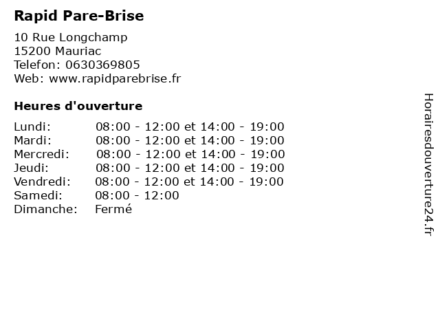 1 Mondial Pare-Brise - Point Relais (Distance: 0,79 km) 1 Rue du 19 Mars 1962, 15200 Mauriac brise, mondial, pare, point, relais 2 Rapid Pare-Brise (Distance: 35,04 km) 114 avenue Charles de Gaulle, 15000 Aurillac auto, bris de glace, brise, centre, pare, pare brise, rapid, réparation 3 Rapid Pare-Brise (Distance: 41,31 km) - La Bitarelle, 19800 Gimel-les-Cascades automobile, brise, pare, pare-brise, rapid, remplacement, réparation, vitrage, voiture 4 GlassAuto MAURIAC (Distance: 0,17 km) Avenue Augustin Chauvet, 15200 Mauriac changement pare-brise, changement vitrage, garage automobile, glassauto, mauriac, optiques de phare, remplacement pare-brise, remplacement vitrage, réparation pare-brise, réparation vitrage, rétroviseurs, toit ouvrant 5 NewCo (Distance: 0,26 km) . Avenue Augustin Chauvet, 15200 Mauriac accessoires, chemise, mode, newco, pantalon, style, vetement 6 Garage AD Expert - LJ Automobiles (Distance: 0,37 km) 4 rue des Saignes, 15200 Mauriac ad, auto, automobiles, concessionnaire, distribution, expert, garage, lj, motos |