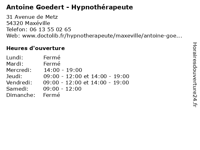 | Jeudi | 09:00-12:00 et 14:00-19:00 |