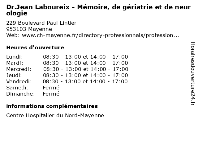 | Jeudi | 08:30-13:00 et 14:00-17:00 |