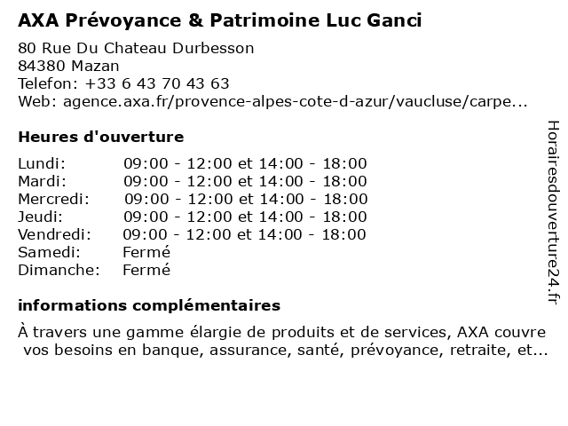 1 AXA Assurance et Banque Nicolet Adragna (Distance: 0,06 km) 45 Rue la Chapellerie, 84200 Carpentras adragna, assurance, assurance appartement, assurance auto, assurance entreprise, assurance epargne, assurance habitation, assurance maison, assurance professionnelle, assurance santé, assurance voiture, axa, banque, et, nicolet 2 AXA Prévoyance & Patrimoine Arnaud Reynoird (Distance: 0,51 km) 828 Avenue des Marchés, 84200 Carpentras arnaud, assurance décès, assurance entreprise, assurance epargne, assurance invalidité, assurance patrimoine, assurance profession libérale, assurance protection juridique, assurance prévoyance, assurance santé, assurance vie, axa, patrimoine, prévoyance, reynoird 3 Dando Jean-Luc FERRONNERIE METALLERIE (Distance: 0,52 km) 500 Rue Edouard Daladier, 84200 Carpentras dando, ferronnerie, jean, luc, metallerie 4 Axa Assurance (Distance: 2,10 km) 45 Boulevard Albin Durand, 84200 Carpentras assurance, assurance prêt, assurances, axa, services 5 AXA Nicolet patrick Agent Général (Distance: 2,21 km) 282 Avenue Pierre Semard, 84200 Carpentras agent, axa, général, nicolet, patrick 6 Axa Assurance (Distance: 2,28 km) 236 Allee Jean Jaures, 84200 Carpentras assurance, assurance prêt, assurances, axa, services |