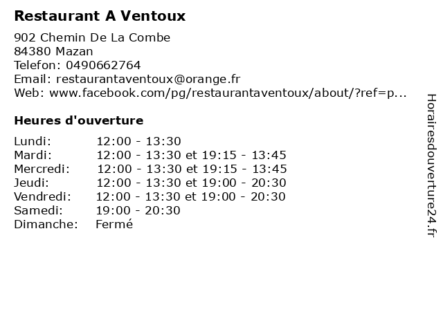 | Mercredi | 12:00-13:30 et 19:15-13:45 |