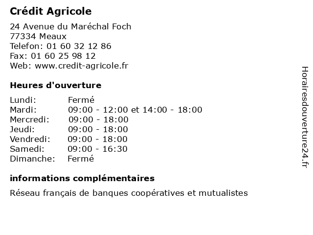 1 Crédit Agricole (Distance: 0,36 km) 29 Rue de la Crèche, 77100 Meaux agence, agricole, assurance, bancaire, banque, crédit 2 Crédit Agricole (Distance: 0,88 km) 14 Rue du Grand Cerf, 77102 Meaux agence, agricole, assurance, bancaire, banque, crédit 3 Crédit Agricole (Distance: 1,83 km) - Allée Jean-Louis Barrault, 77100 Meaux agence, agricole, assurance, bancaire, banque, crédit 4 Crédit Agricole (Distance: 11,35 km) 46 Rue du Général Maunoury, 77165 Saint-Soupplets agence, agricole, assurance, bancaire, banque, crédit 5 Crédit Agricole (Distance: 15,48 km) - Rue des Sources, 77178 Saint-Pathus agence, agricole, assurance, bancaire, banque, crédit 6 Crédit Agricole (Distance: 16,93 km) 10 Avenue de la Gare, 77230 Saint-Mard agence, agricole, assurance, bancaire, banque, crédit |