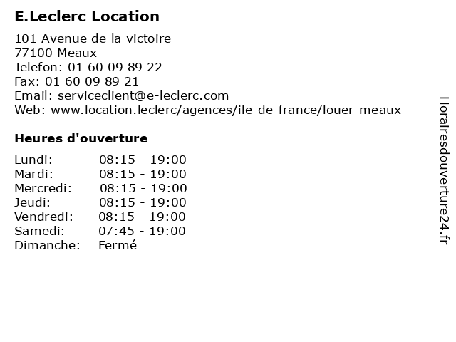1 E.Leclerc Location (Distance: 3,77 km) 30 Mail de la grande haie, 77100 Mareuil Les Meaux auto, e.leclerc, fourgon, location, voiture 2 E.Leclerc Location (Distance: 15,53 km) 23 Avenue de rebais, 77260 La Ferté-sous-Jouarre auto, e.leclerc, fourgon, location, voiture 3 E.Leclerc Location (Distance: 16,51 km) - ZAE du clos rose, 77144 Montevrain agence de location de camions, de, e.leclerc, lieu de covoiturage, location, véhicules 4 E.Leclerc Location (Distance: 19,36 km) - Centre Commercial Les Portes du Valois, 60330 Le Plessis Belleville agence de location de camions, de, e.leclerc, lieu de covoiturage, location, véhicules 5 E.Leclerc Nos Animaux (Distance: 0,02 km) 101 Avenue de la victoire, 77100 Meaux animaux, e.leclerc, fournisseur de clôtures pour animaux domestiques, magasin d'aquariums, magasin pour animaux de compagnie, nos, toiletteur 6 E.Leclerc Drive (Distance: 0,03 km) 101 avenue de la Victoire, 77100 Meaux alimentation, drive, e.leclerc, supermarché |