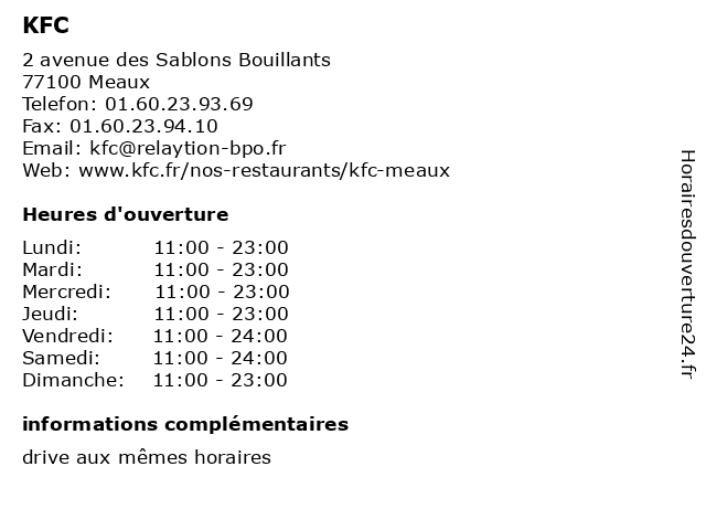 2 KFC Montevrain (Distance: 15,80 km) Avenue de la ferme briarde Parc Commercial " clos du chêne ", 77600 Chanteloup en brie burgers et buckets, frites, kfc, montevrain, poulet et bucket, restaurant 3 KFC Drive (Distance: 17,05 km) . rue Souilly, 77410 Claye-Souilly boissons, burger, drive, fastfood, frites, kfc, restaurant 5 KFC Restaurant (Distance: 19,09 km) . Zac de la Courtillière, 77400 Saint-Thibault des Vignes burgers et buckets, frites, kfc, poulet et bucket, restaurant 6 KFC Saint-Thibault (Distance: 19,29 km) Rue Lamartine, 77400 Saint-Thibault-des-Vignes kfc, saint, thibault |