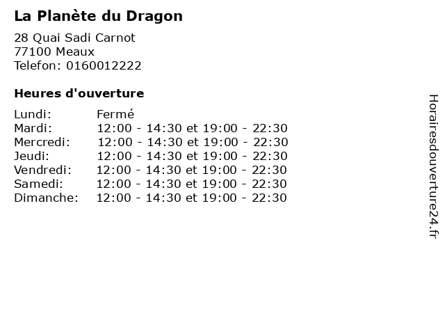 | Mardi | 12:00-14:30 et 19:00-22:30 |