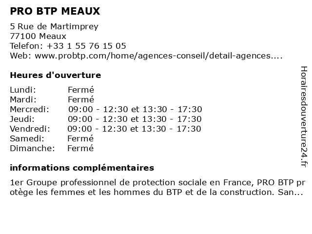 1 PRO BTP (Distance: 0,00 km) 5 rue Martimprey, 77100 Meaux agence, assurance, btp, courtiers, pro, prévoyance, santé 2 CRIT MEAUX BTP - Industrie (Distance: 0,29 km) 21 Quai de la Grande Île, 77100 Meaux btp, crit, industrie, meaux 5 Samsic Emploi Chessy BTP (Distance: 13,58 km) 24 Avenue Hergé, 77700 Chessy btp, chessy, emploi, intérim, recrutement, samsic 6 ACCESS CREDITS PRO - MARNE-LA-VALLEE (Distance: 14,36 km) 14 Avenue de l'Europe, 77144 Montévrain access, agence de courtage, cabinet de courtage pro, courtage banque, courtage entreprise, courtier crédit banque, courtier crédit professionne, courtier en finance, courtier pour entreprise, credits, crédit pro, la, marne, pro, vallee |
