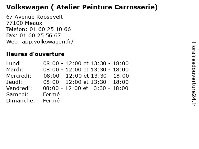 1 Volkswagen ( Atelier Carrosserie) (Distance: 0,00 km) 67 Avenue Roosevelt, 77100 Meaux atelier, automobiles, carrosserie, concessionnaire, garage, motos, volkswagen 4 SAFI - PRECISION AUTOMOBILES (Atelier de Carrosserie) (Distance: 1,86 km) 40 Rue François de Tessan, 77100 Meaux atelier, automobiles, carrosserie, de, entretien, precision, révisions, safi, services d'automobiles, vidanges 6 |