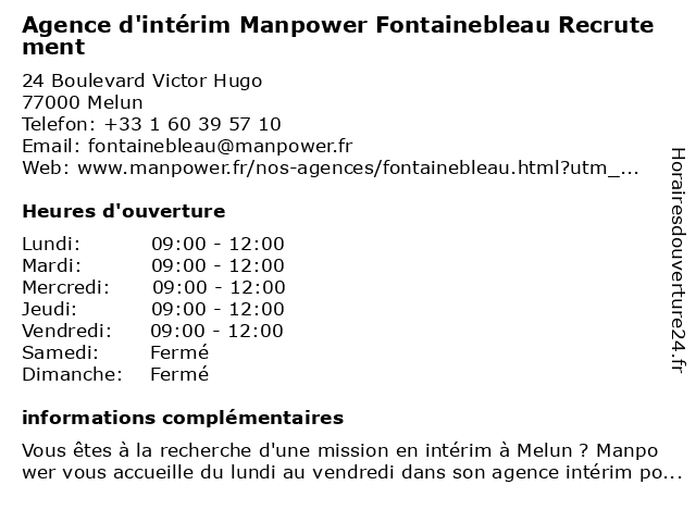 1 Agence d'intérim Manpower Fontainebleau Recrutement (Distance: 0,00 km) 24 Boulevard Victor Hugo, 77000 Melun agence de recrutement, agence intérim, agence pour l'emploi, cabinet de recrutement, cdi, intérim, recrutement 2 Agence d'intérim Manpower Fontainebleau Recrutement (Distance: 0,00 km) 24 Boulevard Victor Hugo, 77000 Melun agence de recrutement, agence intérim, agence pour l'emploi, cabinet de recrutement, cdi, intérim, recrutement 3 Agence d'intérim Manpower Melun BTP Recrutement (Distance: 0,00 km) 24 Boulevard Victor Hugo, 77000 Melun agence de recrutement, agence intérim, agence pour l'emploi, cabinet de recrutement, cdi, intérim, recrutement 4 Axxis Intérim & Recrutement (Distance: 11,86 km) 9-11 rue Georges Charpak, 77127 Lieusaint agence, axxis, interim, intérim, recrutement 5 Agence d'intérim Manpower lieusaint Recrutement (Distance: 12,75 km) 1 Rue Georges Charpak, 77127 Lieusaint agence de recrutement, agence intérim, agence pour l'emploi, cabinet de recrutement, cdi, intérim, recrutement 6 Leader Intérim (Distance: 15,41 km) 35 rue Feray, 91100 Corbeil Essonnes agence, interim, intérim, leader |