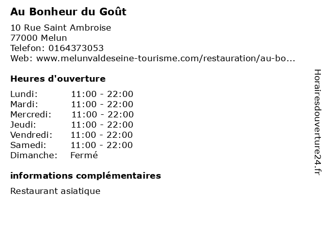 1 Au Bonheur du Goût MADAME MENJRU XU (Distance: 0,09 km) 10 Rue Saint-ambroise, 77000 Melun au, bonheur, du, goût, madame, menjru, xu 2 Restaurant Bonheur de Chine (Distance: 0,72 km) 19 Place Saint-Jean, 77000 Melun asiatique, bonheur, chine, de, restaurant, restaurants, zen 3 Le Jardin Du Goût (Distance: 3,78 km) 188 Allée Du Bois Gaillard, 77190 Dammarie-les-Lys buffet, du, goût, jardin, le, plats, restauration, traiteur 4 École Elémentaire Publique Rosa Bonheur (Distance: 8,47 km) 17 Rue des Ecoles, 77930 Chailly-en-Bière bonheur, cours, education, elémentaire, publique, rosa, services, école, élémentaire 5 Du Bonheur en Pétales (Distance: 10,66 km) 21 Rue de l'Hôtel de Ville, 77820 Le Châtelet-en-Brie bonheur, bouquets, composition, du, en, fleuriste, fleurs, mariage, plantes, pétales 6 L'Atelier du Goût (Distance: 14,78 km) 8 Rue des 3 Maillets, 77300 Fontainebleau bar, brasserie, café, du, goût, l'atelier, restaurant, restauration |