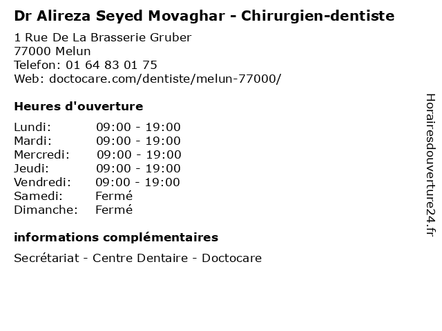 1 Dr Alireza Pak - Médecin généraliste (Distance: 25,86 km) 5 Avenue Henri Barbusse, 91270 Vigneux-sur-Seine alireza, dr, généraliste, médecin, médecine, médical, pak, pharmaceutique, traitement 2 Alamdari Alireza (Distance: 32,80 km) 96 Boulevard de Champigny, 94210 Saint-Maur-des-Fossés alamdari, alireza 3 Dr Alireza Pak - Médecin généraliste (Distance: 40,24 km) 27 Rue de l'Amiral Mouchez, 75013 Paris alireza, docteur, dr, generaliste, généraliste, medical, médecin, pak, soin 4 Dr R. Movaghar - Orthodontiste à Paris (Distance: 42,58 km) 16 Rue Rosenwald, 75015 PARIS dr, movaghar, orthodontiste, paris, r. 5 Dr. Alireza Seyed Movaghar - Dentiste (Distance: 42,59 km) 16 Rue Rosenwald, 75015 Paris alireza, dentiste, docteur, dr., medecins, movaghar, sante, seyed 6 Cabinet d'orthodontie enfant et adulte du Dr Reza Movaghar (Distance: 42,59 km) 16 Rue Rosenwald, 75015 Paris adulte, cabinet, clinic, d'orthodontie, dental, dentist, dr, du, enfant, et, movaghar, reza |