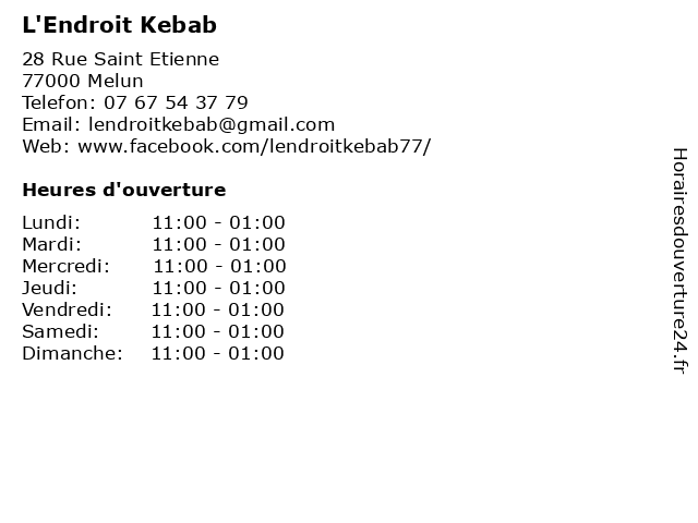 1 Kebab Time (Distance: 0,73 km) 30 Avenue Thiers, 77000 Melun bar, bistro, bistrot, brasserie, café, kebab, pub, restaurant, restauration, resto, time, turc 2 Restaurant Kebab Le Constantinople (Distance: 7,38 km) 2 Avenue de la Forêt, 77590 Bois-le-Roi bar, bistro, bistrot, brasserie, café, constantinople, kebab, kebab;kebabs, le, oriental, restaurant, restauration, turc 3 Istanbul Kebab House (Distance: 8,70 km) 67 avenue Louise Michel, 77176 Savigny Le Temple bar, bistro, bistrot, brasserie, café, house, istanbul, kebab, pub, restaurant, restauration, resto, turc 4 Istanbul Kebab - Bar de l’Europe (Distance: 10,48 km) 19 Rue Du 26 Août 1944, 77820 Le Châtelet-en-Brie bar, café, de, istanbul, kebab, l’europe, restaurants, saz 5 Kebab La Mama (Distance: 14,17 km) 3 Avenue du Général de Gaulle, 77210 Avon food, kebab, la, mama, nour, restaurants 6 Restaurant Adana Kebab (Distance: 14,67 km) 3 Boulevard John Kennedy, 91100 Corbeil-Essonnes adana, burger, cuisine, fast food, kebab, restaurant, restaurants, turc |