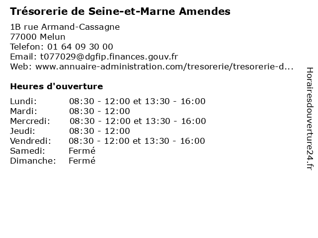 1 Trésorerie de Melun Val Seine SPL (Distance: 0,33 km) 20 quai Hippolyte-Rossignol, 77010 Melun administration, de, finances, impots, melun, public, publiques, publiv, seine, service, spl, tresor, tresorerie, trésorerie, val 3 Trésorerie (Distance: 0,72 km) 4 rue des Fossés, 77000 Melun administration, assoc, services, services publics, trésorerie 4 Paierie départementale - Seine et Marne (Distance: 0,74 km) 4 rue des Fossés, 77000 Melun administration, association, déclarations, départementale, emplois, employeurs, et, marne, paierie, seine, travails 5 Conseil Départemental de Seine-et-Marne (Distance: 0,93 km) 12 Rue des Saints-Pères, 77000 Melun administration, assoc, conseil, de, départemental, et, marne, seine, services, services publics 6 Préfecture de Seine-et-Marne (Distance: 0,93 km) 12 rue des Saints-Pères, 77000 Melun central, de, et, gouvernement, marne, nra, prefecture, préfecture, seine |