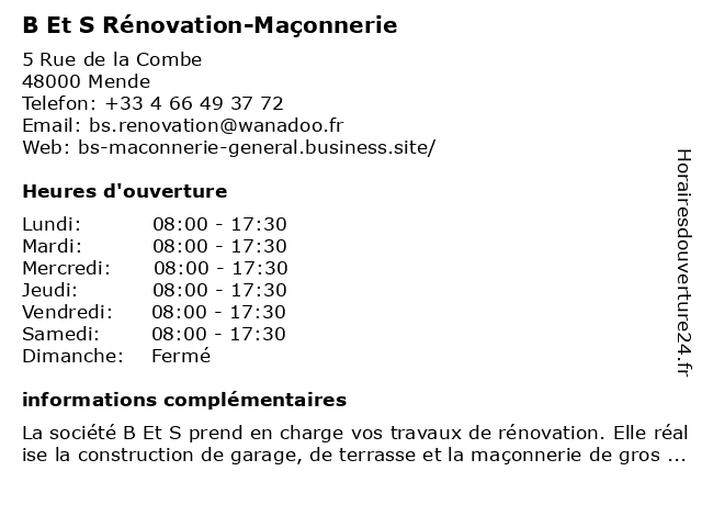 1 B & S Rénovation - Maçonnerie (Distance: 0,00 km) 5 bis rue de Lacombe, 48000 Mende bs, général, maison, maçonnerie, rénovation, travaux 2 Gineste Didier Maçonnerie (Distance: 18,63 km) 17 Chemin des Plots, 48320 Ispagnac didier, gineste, maçonnerie 3 Vaz Ravalement (Distance: 0,23 km) 5 Rue des Sauvagelles, 48000 Mende façades, maçonnerie, ravalement, travaux, vaz 6 ALARY PATRICK-HENRI (Distance: 57,06 km) Le Mazuc, 12310 BERTHOLENE alary, création de monuments funéraires, henri, maçon, maçonnerie, maçonnerie générale, maçonnerie pierre et rénovation de batiment, patrick |