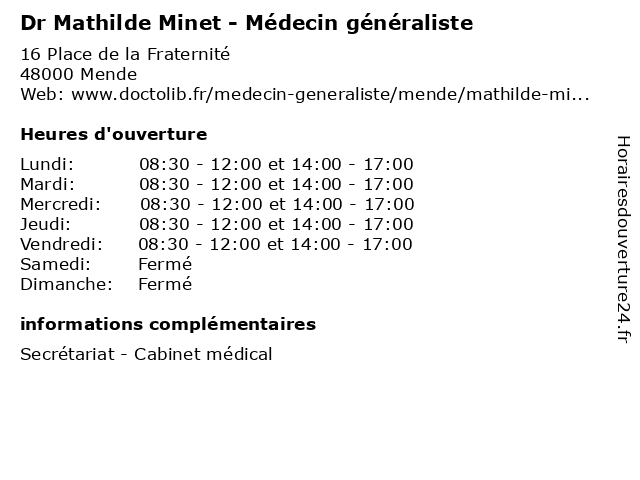 | Lundi | 08:30-12:00 et 14:00-17:00 |