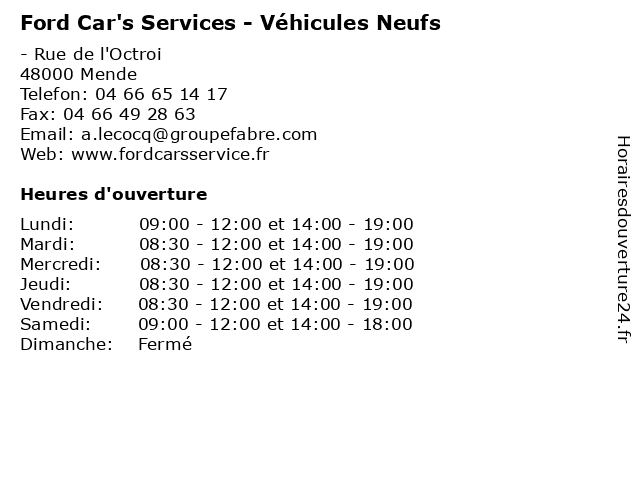 1 Ford Car's Services - Véhicules d'Occasion (Distance: 0,00 km) - Rue de l'Octroi, 48000 Mende car's, d'occasion, entretien, ford, révisions, services, services d'automobiles, vidanges, véhicules 2 Ford Car's Services - Ford Entreprise (Distance: 0,00 km) - Rue de l'Octroi, 48000 Mende car's, entreprise, entretien, ford, révisions, services, services d'automobiles, vidanges 3 Ford Car's Services - Financement (Distance: 0,00 km) - Rue de l'Octroi, 48000 Mende car's, entretien, financement, ford, révisions, services, services d'automobiles, vidanges 4 Ford Car's Services - Entretien (Distance: 0,00 km) - Rue de l'Octroi, 48000 Mende car's, entretien, ford, révisions, services, services d'automobiles, vidanges 5 Ford Car's Services - Atelier de Carrosserie (Distance: 0,00 km) - Rue de l'Octroi, 48000 Mende atelier, car's, carrosserie, de, entretien, ford, révisions, services, services d'automobiles, vidanges 6 Ford Car's Services - Pièces et Accessoires (Distance: 0,00 km) - Rue de l'Octroi, 48000 Mende accessoires, car's, entretien, et, ford, pièces, révisions, services, services d'automobiles, vidanges |