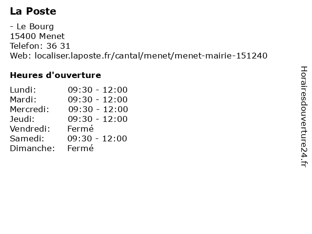 1 La Poste (Distance: 0,37 km) Le Bourg, 15400 Saint-Étienne-de-Chomeil agence, assurance, banque, banque postale, bureau de poste, chronopost, colis, courrier, dps, expéditions internationales, la, point, postale, poste, relais, timbres, téléphonie, ups, western union 2 La Poste (Distance: 0,38 km) - Le Bourg, 15400 Menet agence, colis, courrier, expédition, la, postale, poste 3 La Poste (Distance: 7,49 km) - Le Bourg, 15190 Saint-Amandin agence, assurance, banque, banque postale, bureau de poste, chronopost, colis, courrier, dps, expéditions internationales, la, point, postale, poste, relais, timbres, téléphonie, ups, western union 4 La Poste (Distance: 12,48 km) 1 Place Marie Aimée Méraville, 15190 Condat agence, colis, courriers, expédition, la, postale, poste, relais 6 La Poste (Distance: 13,06 km) - Le Bourg, 63113 Picherande colis, express chronopost, expédition, la, poste, réexpédition internationale, service, suivi du courrier |