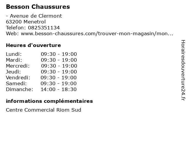 1 Besson Chaussures (Distance: 13,83 km) 1 Rue des Frères Montgolfier, 63170 Aubière besson, chaussures, enfants, homme, mode femme 2 Besson Chaussures (Distance: 14,02 km) 67 Avenue d'Aubière, 63800 Cournon besson, chaussures, enfants, homme, mode femme 4 Chaussures Chaderas (Distance: 11,10 km) 8 Rue Tour la Monnaie, 63000 Clermont-Ferrand accessoires, baskets, boots, chaderas, chaussons, chaussures, sandales 5 Maître Morgane Besson - Avocate (Distance: 11,35 km) 39 Rue Amadéo, 63000 Clermont-Ferrand avocate, avocats, besson, cabinet, conseils, contentieux, juridique, justice, litiges, maître, morgane, services 6 Breuil Chaussures - Rive Droite-Rive Gauche (Distance: 11,56 km) 22 Rue Maréchal Foch, 63000 Clermont-Ferrand accessoires, breuil, chaussures, droite, gauche, magasin, rive, sacs |