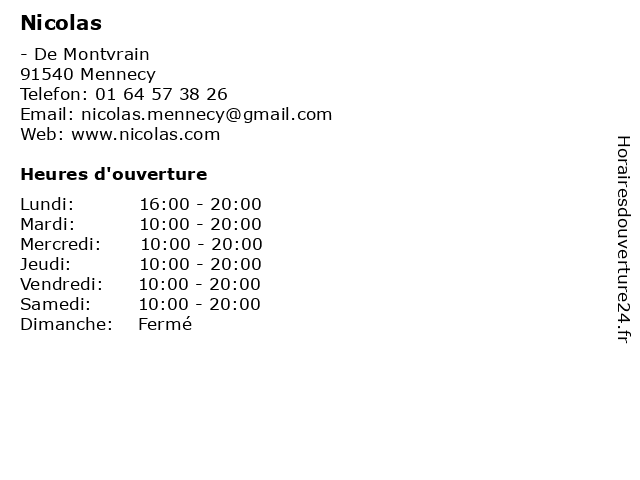 1 Nicolas (Distance: 15,56 km) - Rue de la Garde, 91800 Brunoy champagnes, hyper-supermarchés, nectars, nicolas, vente au détail de vin, vin 2 Nicolas (Distance: 15,96 km) - Yerres, 91330 Yerres champagnes, hyper-supermarchés, nectars, nicolas, vente au détail de vin, vin 3 Nicolas Mennecy (Distance: 0,83 km) 2 Rue Jean Cocteau, 91540 Mennecy champagnes, cidre, mennecy, nicolas, rhums, rosé, ruinart, spiritueux, vins, vins blancs, vins rouges, whiskies 4 Dr Nicolas Renard - Chirurgien dentiste (Distance: 5,62 km) 40 avenue Serge Dassault, 91106 Corbeil-Essonnes ch, chirurgien, corbeil, dentaire, dentiste, dr, essonnes, francilien, implantologie, nicolas, parodontologie, renard, stomatologue, sud 5 Dr Nicolas Chausson - Neurologue (Distance: 5,62 km) 40 avenue Serge Dassault, 91106 Corbeil-Essonnes cerveau, ch, chausson, corbeil, dr, essonnes, francilien, nerf, neurologie, neurologue, nicolas, sud 6 École maternelle publique Nicolas-Jacques Conté (Distance: 6,03 km) . Rue de l'École, 91000 Évry conté, cours, jacques, maternelle, n.j.conté, nicolas, publique, services, école |