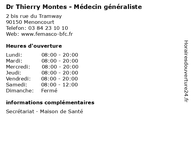 1 Dr. Thierry Di Betta - Médecine générale (Consultation libre) (Distance: 0,79 km) 155 avenue Jean Jaures, 90000 Belfort betta, consultation, di, docteur, dr., générale, libre, médecine, santé, thierry 2 Dr Thierry Muller - Médecin généraliste (Distance: 7,02 km) - Rue des Chenevières, 70400 Mandrevillars docteur, dr, generaliste, généraliste, medical, muller, médecin, soin, thierry 3 Dr Thierry Spicarolen - ORL (Distance: 8,18 km) 100 Route de Moval, 90400 Trévenans consultation, docteur, dr, med, médecin, orl, spicarolen, thierry, traitement 4 Dr Thierry Conrozier - Rhumatologue (Distance: 8,18 km) 100 Route de Moval, 90400 Trévenans conrozier, consultation, docteur, dr, med, médecin, rhumatologue, thierry, traitement 6 |