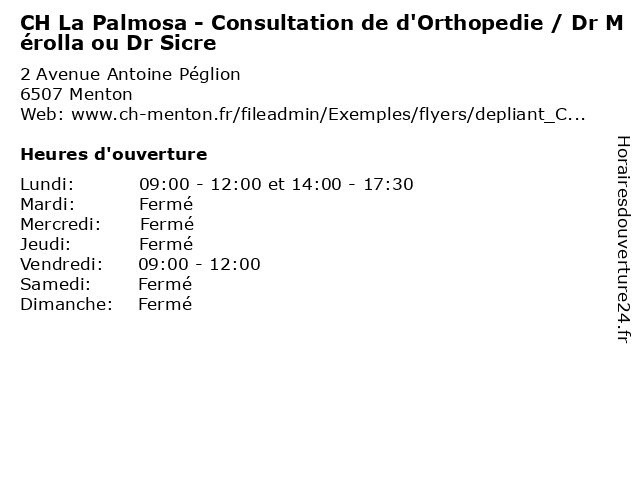 1 CH La Palmosa - Consultation d’Anesthésie (Distance: 0,00 km) 2 Avenue Antoine Péglion, 06507 Menton bureau, ch, consultation, dr, d’anesthésie, la, maladie, med, médecin, médecine, palmosa, pratique, thérapie, traitement 2 CH La Palmosa - Consultation de Cardiologie (Distance: 0,00 km) 2 Avenue Antoine Péglion, 06507 Menton bureau, cardiologie, ch, consultation, de, dr, la, maladie, med, médecin, médecine, palmosa, pratique, thérapie, traitement 3 CH La Palmosa - Consultation Dentaire (Distance: 0,00 km) 2 Avenue Antoine Péglion, 06507 Menton bureau, ch, consultation, dentaire, dr, la, maladie, med, médecin, médecine, palmosa, pratique, thérapie, traitement 4 CH La Palmosa - Consultation Psychologue (Distance: 0,00 km) 2 Avenue Antoine Péglion, 06507 Menton bureau, ch, consultation, dr, la, maladie, med, médecin, médecine, palmosa, pratique, psychologue, thérapie, traitement 5 CH La Palmosa - Consultation de Diététique (Distance: 0,00 km) 2 Avenue Antoine Péglion, 06507 Menton bureau, ch, consultation, de, diététique, dr, la, maladie, med, médecin, médecine, palmosa, pratique, thérapie, traitement 6 CH La Palmosa - Consultation de Gastro-entérologie (Distance: 0,00 km) 2 Avenue Antoine Péglion, 06507 Menton bureau, ch, consultation, de, dr, entérologie, gastro, la, maladie, med, médecin, médecine, palmosa, pratique, thérapie, traitement |