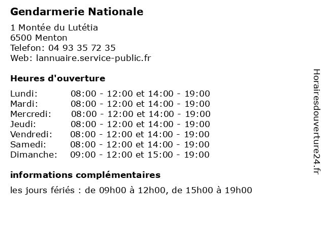 1 Gendarmerie Nationale (Distance: 8,24 km) 31 Chemin du Moulin, 06320 La Turbie brigade, commandant, communauté, gendarme, gendarmerie, nationale, proximité, sécurité 2 Gendarmerie Nationale (Distance: 9,22 km) 60 Avenue du 3 Septembre 1945, 06320 Cap-d'Ail brigade, commandant, communauté, gendarme, gendarmerie, nationale, proximité, sécurité 3 Gendarmerie Nationale (Distance: 11,70 km) 15 Boulevard de Verdun, 06380 Sospel brigade, commandant, communauté, gendarme, gendarmerie, nationale, proximité, sécurité 4 Gendarmerie Nationale (Distance: 11,99 km) 395 Avenue du Maréchal Leclerc, 06360 Èze brigade, commandant, communauté, gendarme, gendarmerie, nationale, proximité, sécurité 5 Gendarmerie Nationale (Distance: 13,11 km) 2 Chemin du Castel, 06440 L'Escarène brigade, commandant, communauté, gendarme, gendarmerie, nationale, proximité, sécurité 6 Gendarmerie Nationale (Distance: 14,04 km) 9 Rue Christian Mangiapan, 06390 Contes brigade, commandant, communauté, gendarme, gendarmerie, nationale, proximité, sécurité |